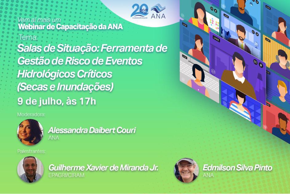 Quinta-feira, 09 de julho, 17h a Agência Nacional de Águas (ANA) vai debater sobre “SALAS DE SITUAÇÃO: FERRAMENTA DE GESTÃO DE RISCO DE EVENTOS HIDROLÓGICOS CRÍTICOS (SECAS E INUNDAÇÕES)”.