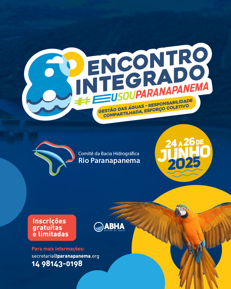 “Gestão das Águas – responsabilidade compartilhada, esforço coletivo” é o mote do 8º Encontro Integrado do Paranapanema, promovido pelo Comitê da Bacia Hidrográfica do Rio Paranapanema (CBH Paranapanema), em Pirapozinho/SP, entre os dias 24 e 26 de junho. O evento que reúne os membros dos sete Comitês instalados no Paranapanema (CBHs Alto, Médio e Pontal do Paranapanema, na vertente paulista; CBHs Norte Pioneiro, Tibagi e Piraponema, na vertente paranaense; e o Comitê Interestadual do Paranapanema) para fortalecer os trabalhos em prol das águas.