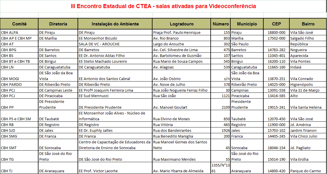 1 - As salas da Rede do Saber nas Diretorias de Ensino nas cidades-sede dos CBH (com exceção dos CBH LN, SM e AT, conforme arquivo anexo), estarão ativadas para a participação dos membros das CTEA e convidados, o que significa que haverá interação por meio de imagem e som desses locais de transmissão com a rede. Nas Diretorias de Ensino onde a sala não estará ativada, os presentes poderão acompanhar por streaming e a interação ocorrerá somente por email.