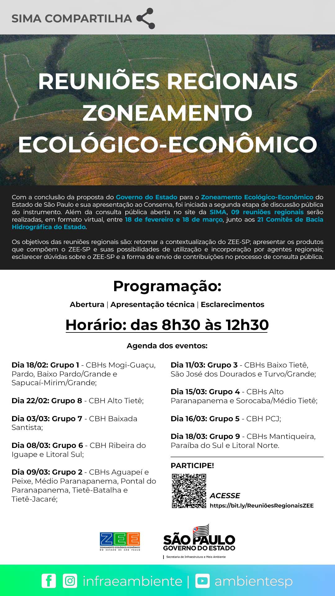 Descrição: Os objetivos das reuniões regionais são: retomar a contextualização do ZEE-SP; apresentar os produtos que compõem o ZEE-SP e suas possibilidades de utilização e incorporação por agentes regionais; esclarecer dúvidas sobre o ZEE-SP e a forma de envio de contribuições no processo de consulta pública.