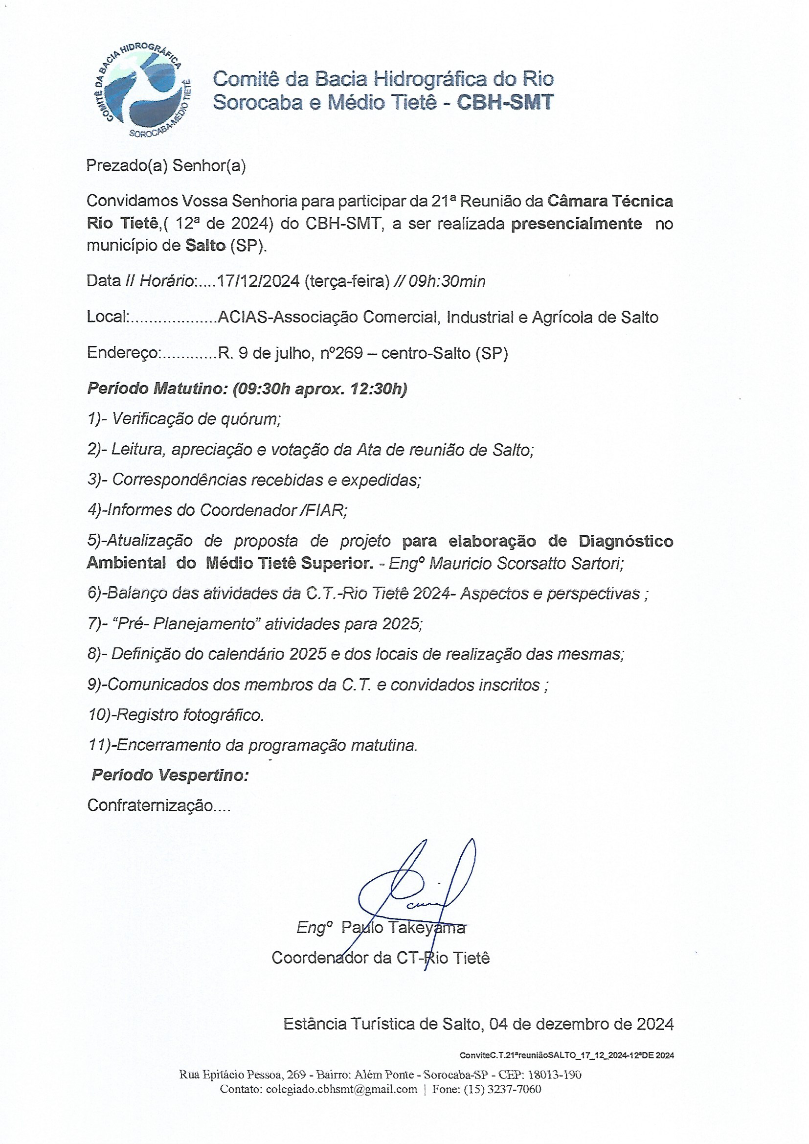 Convidamos Vossa Senhoria para participar da 21 Reunião da Câmara Técnica Rio Tietê, ( decima segunda de 2024) do CBH-SMT, a ser realizada presencialmente no municipio de Salto ( SP).