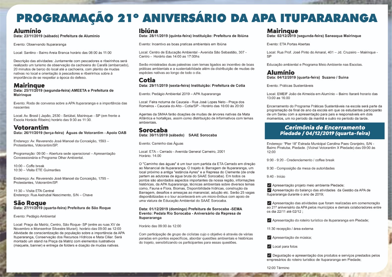 Descrição: Programação das atividades em comemoração ao 21ª aniversário da APA de Itupararanga.