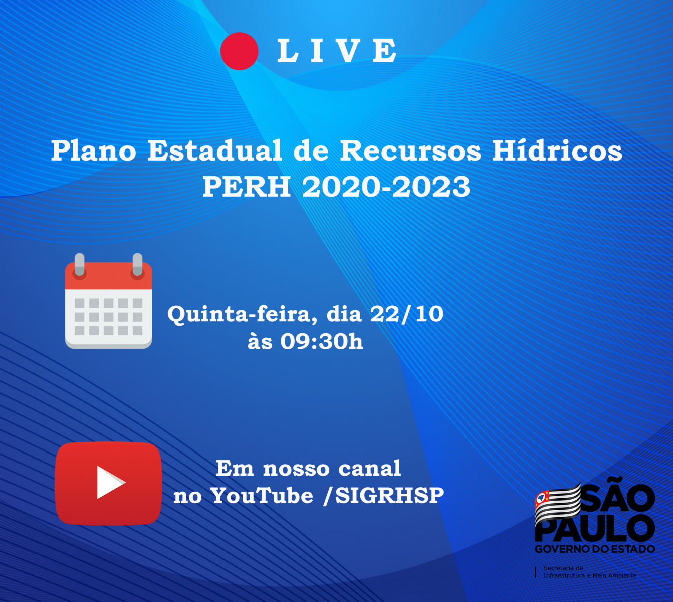 A Coordenadoria de Recursos Hídricos do Estado de São Paulo (CRHi) promove nesta quinta-feira, dia 22/10, a partir das 09:30, a “Live PERH” que será transmitida pelo Youtube no canal /SIGRHSP neste link: https://www.youtube.com/watch?v=cLHoSRUZ4mI