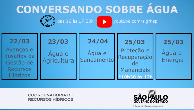 A Coordenadoria de Recursos Hídricos de São Paulo (CRHi), juntamente com a Secretaria de Infraestrutura e Meio Ambiente (SIMA) realizarão na próxima semana, do dia 22 a 25/03 a semana de Lives “Conversando sobre Água” em homenagem ao Dia Mundial da Água, comemorado no dia 22 de março. O evento acontecerá canal do Youtube da CRHi, o SIGRHSP, e abordará água e seus desdobramentos.