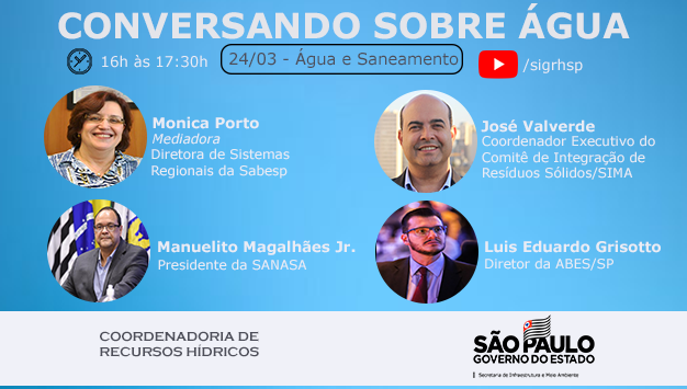 A Coordenadoria de Recursos Hídricos de São Paulo (CRHi), juntamente com a Secretaria de Infraestrutura e Meio Ambiente (SIMA) realiza Semana de Lives “Conversando sobre Água” em homenagem ao Dia Mundial da Água. O evento acontecerá canal do Youtube da CRHi, o SIGRHSP, das 16h às 17:30h.