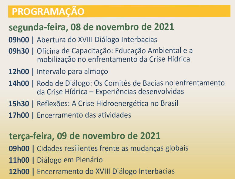 Com a organização dos 21 Comitês de Bacias do Estado de São Paulo acontece, entre os dias 8 e 9 de novembro, o XVIII Diálogo Interbacias de Educação Ambiental na Crise Hídrica.