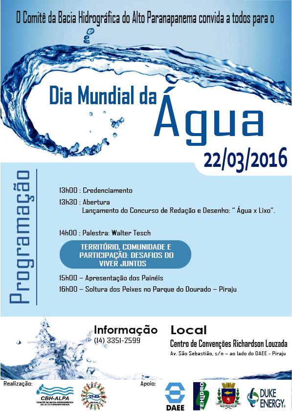 Eventos: “Celebração do dia da Água no Alto Paranapanema com soltura de peixes” e “Abertura do Concurso de redação e desenho para as escolas municipais e estaduais: O que você faz para cuidar das águas?.