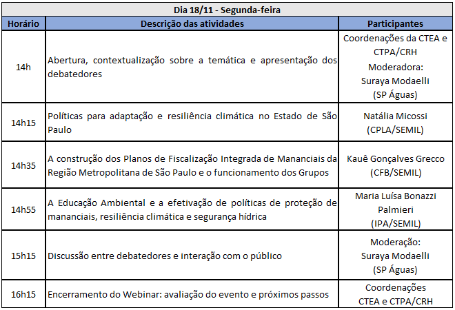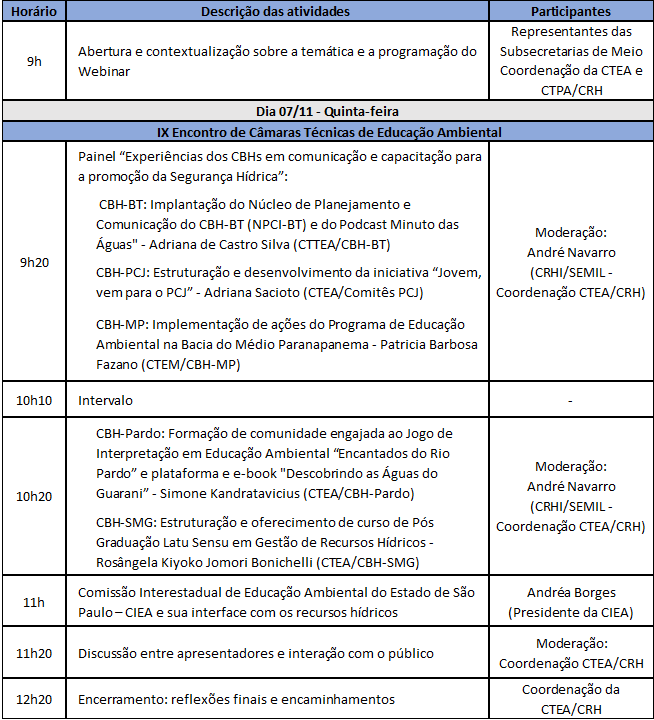 As Câmeras Técnicas de Educação Ambiental, Capacitação, Mobilização Social e Informações em Recursos Hídricos (CTEA) e de Proteção das Águas (CTPA), do Conselho Estadual de Recursos Hídricos (CRH) promovem o Webinar Educação Ambiental e Proteção das Águas: Contribuições em tempos de emergência climática. O evento acontece nos dias 7, 13 e 18 de novembro com transmissão pela TV Água.