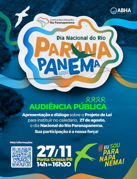 O Comitê da Bacia Hidrográfica do Rio Paranapanema (CBH Paranapanema) realizará, no dia 27 de novembro, de forma híbrida, sendo presencialmente em Ponta Grossa/PR, uma audiência pública, que visa ouvir dos vários setores da sociedade a importância que o Rio Paranapanema tem. Os depoimentos farão parte do processo para que o dia 27 de agosto seja nacionalmente reconhecido como o Dia do Rio Paranapanema, por meio de uma Lei Federal.