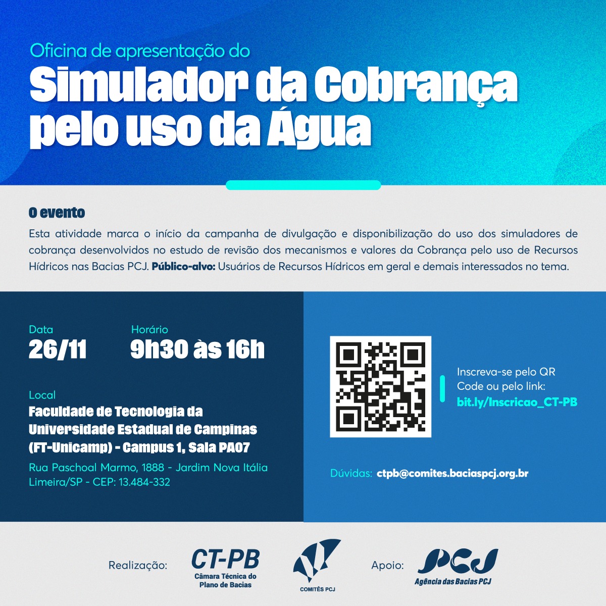 A Câmara Técnica do Plano de Bacias (CT-PB) dos Comitês PCJ realizará em 26 de novembro, das 9h30 às 16h, o evento presencial, “Oficina de apresentação do Simulador da Cobrança pelo uso da Água”.