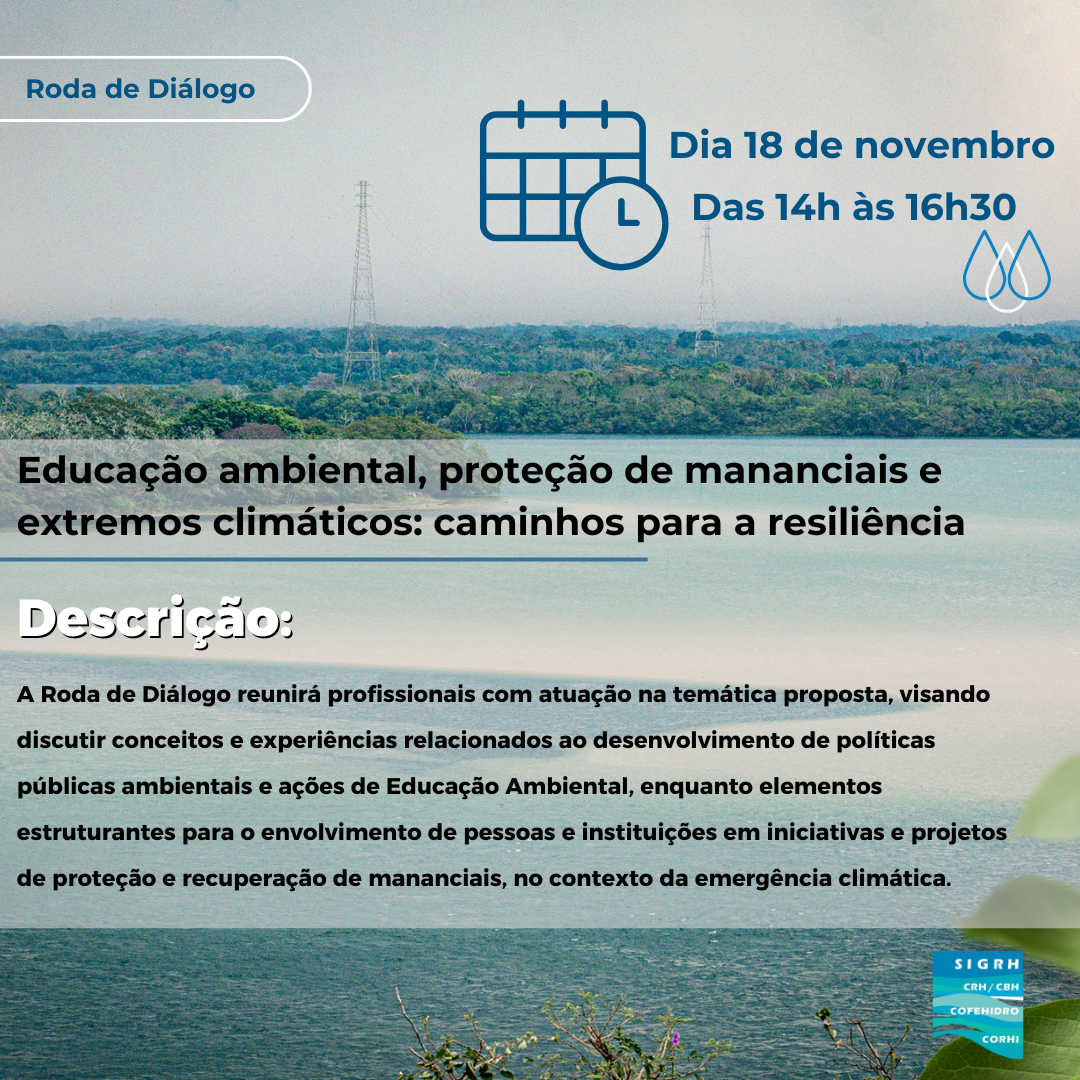 As Câmeras Técnicas de Educação Ambiental, Capacitação, Mobilização Social e Informações em Recursos Hídricos (CTEA) e de Proteção das Águas (CTPA), do Conselho Estadual de Recursos Hídricos (CRH) promovem o Webinar Educação Ambiental e Proteção das Águas: Contribuições em tempos de emergência climática. O evento acontece no dia 18 de novembro, às 14h, com transmissão pela TV Água.