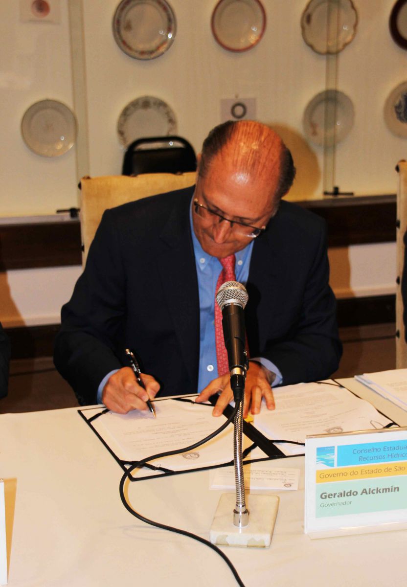 O Governador Geraldo Alckmin participou nesta quarta-feira, dia 14, da última Reunião Extraordinária do Conselho Estadual de Recursos Hídricos (CRH), presidida Secretário de Saneamento e Recursos Hídricos do Estado de São Paulo, Benedito Braga, no Salão dos Pratos, no Palácio dos Bandeirantes, em São Paulo. Na ocasião, Alckmin sancionou o Projeto de Lei nº 192/16, que se tornou a Lei Estadual 16.337/2016 e aprimora os mecanismos do Plano Estadual de Recursos Hídricos (PERH).