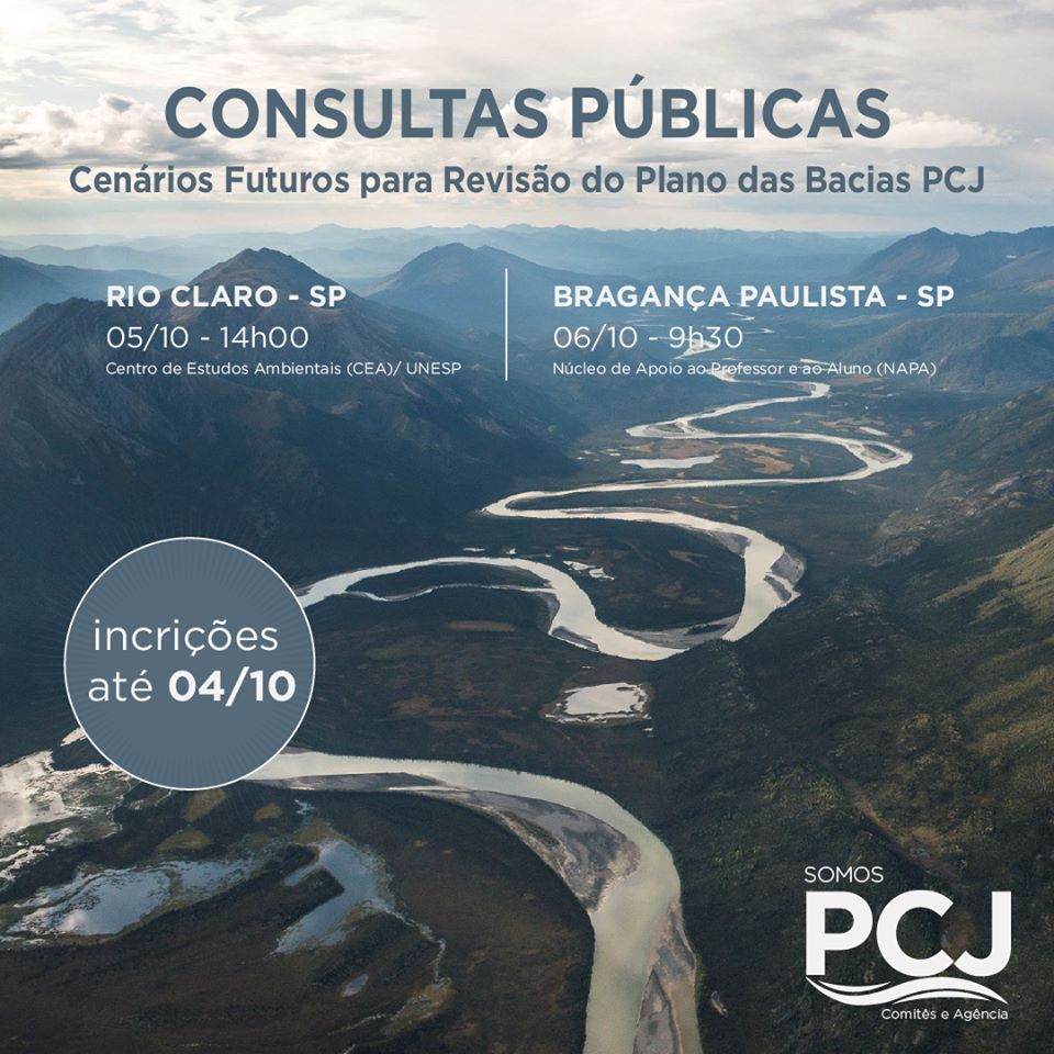 Os Comitês PCJ e a Agência PCJ realizam no início de outubro as Consultas Públicas para a revisão do Plano das Bacias Hidrográficas dos Rios Piracicaba, Capivari e Jundiaí 2010 a 2020. Para facilitar a participação nos encontros, serão duas reuniões, uma em Rio Claro, no dia 5, e outra em Bragança Paulista, no dia 6. As inscrições (clique aqui) podem ser realizadas até 4 de outubro.