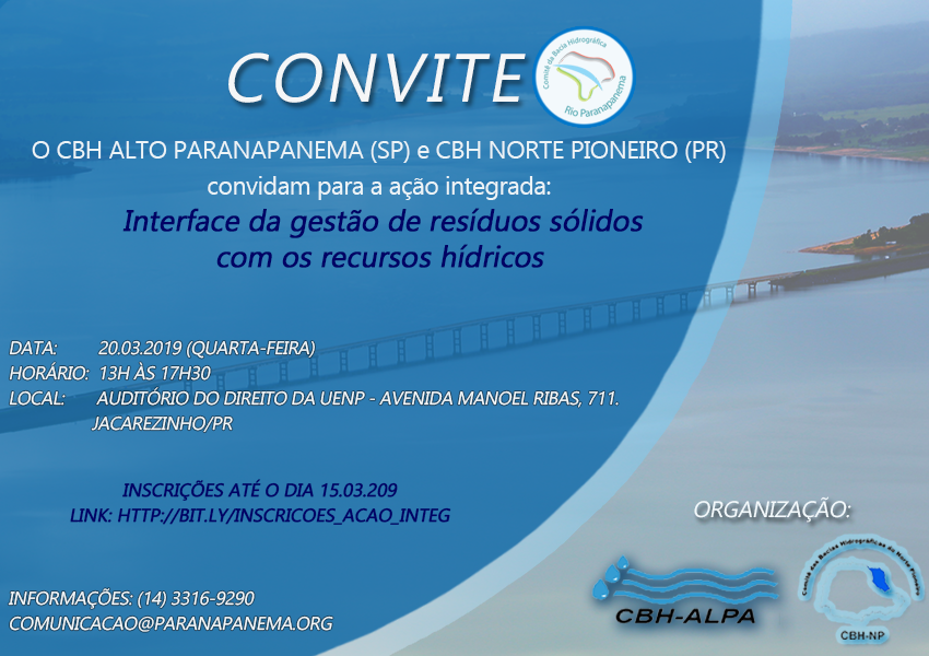 Os Comitês de Bacias Hidrográficas do Alto Paranapanema (SP) e do Norte Pioneiro (PQ) realizarão uma ação integrada sobre resíduos sólidos e recursos hídricos no próximo dia 20/03, quarta-feira, das 13h00 às 17h30 em Jacarezinho/PR.